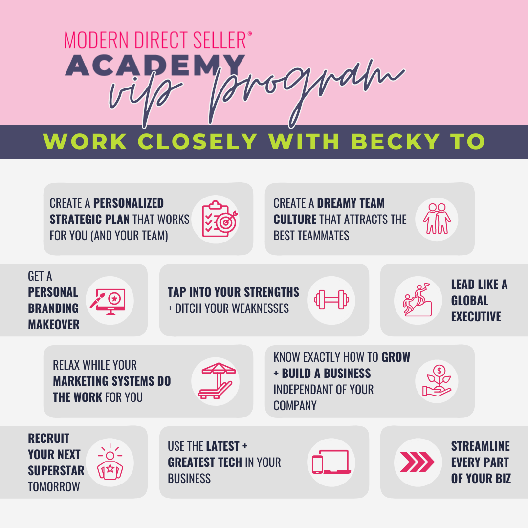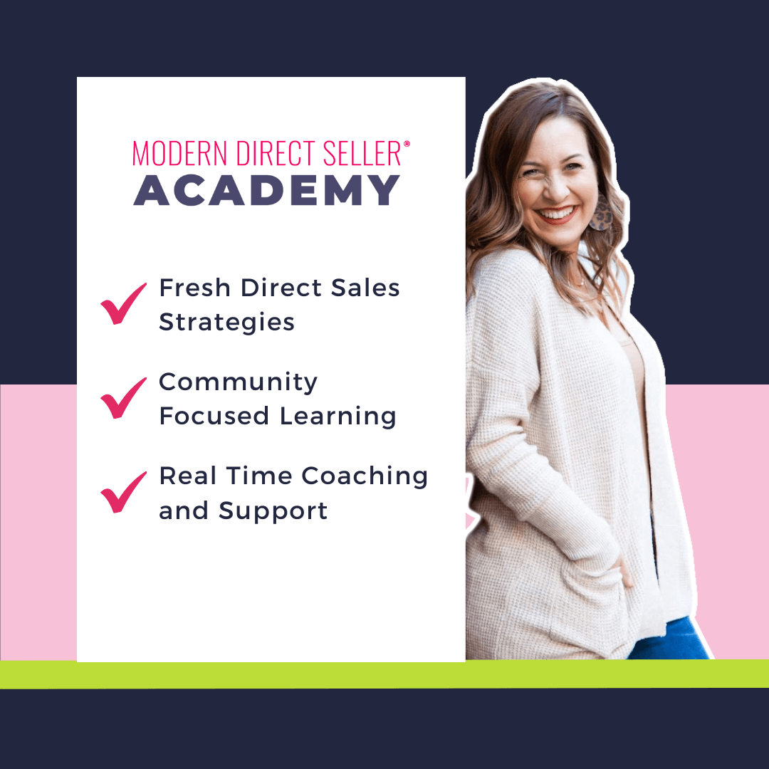 Ready to take your direct sales business to the next level? Then it’s time to join the Modern Direct Seller Academy and gain all that access to exclusive training, coaching, and resources to help you succeed.