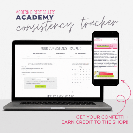 This is a great way to keep yourself (and your biz) on track. When you’re consistent for at least 21 days of the month, you even earn prizes. Yep – $5 to the Modern Direct Seller Shop – just for working your biz. How fun is that?