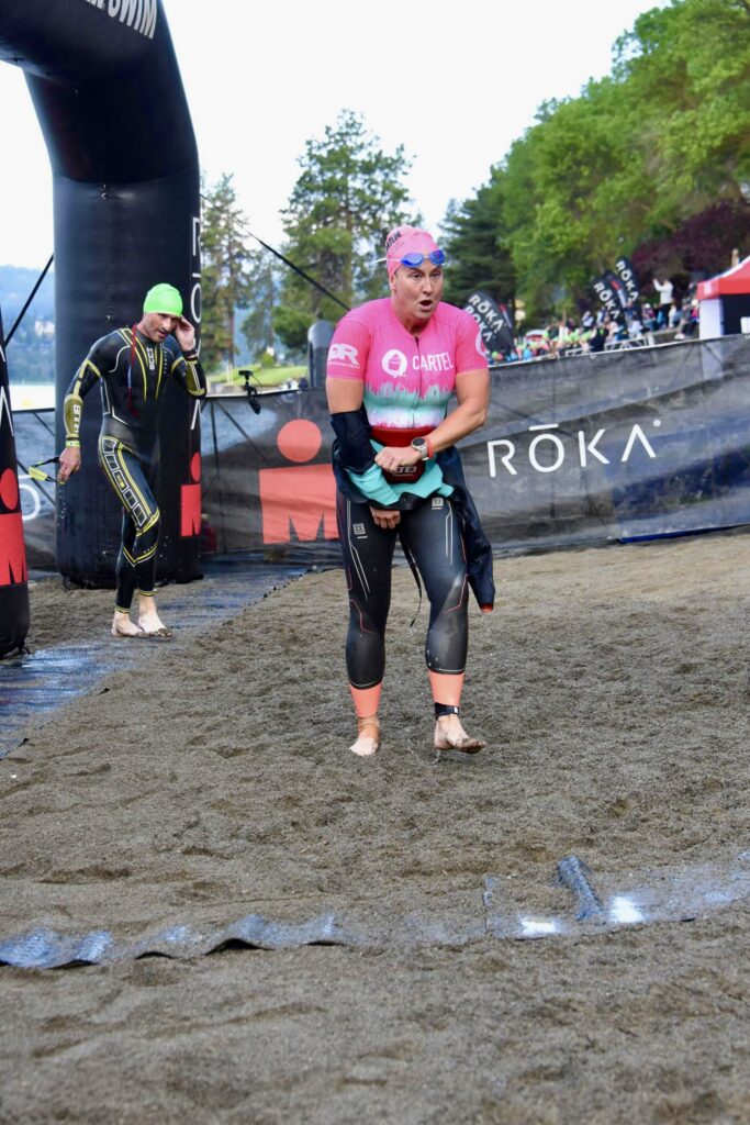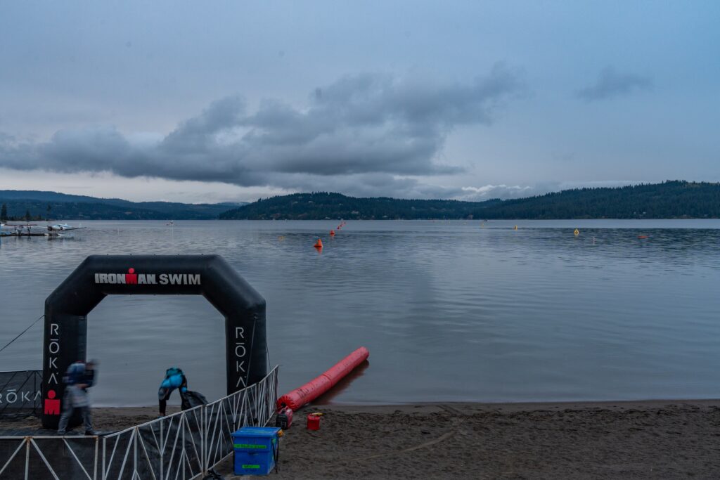 I walked toward the lake, and quickly found Lars.  I put on the bottom part of my wetsuit, chatted a bit, kissed him goodbye, and walked toward the swim staging area. I lined up in the 33-35 min swim finish time (which is normal for me), and waited to be walked on the beach by the volunteers. When I got to the beach, I saw Lars again taking photos, which immediately calmed my nerves and made me focus. Lake CdA is absolutely gorgeous (not far behind Lake Taupo), and I was really looking forward to getting the race underway!