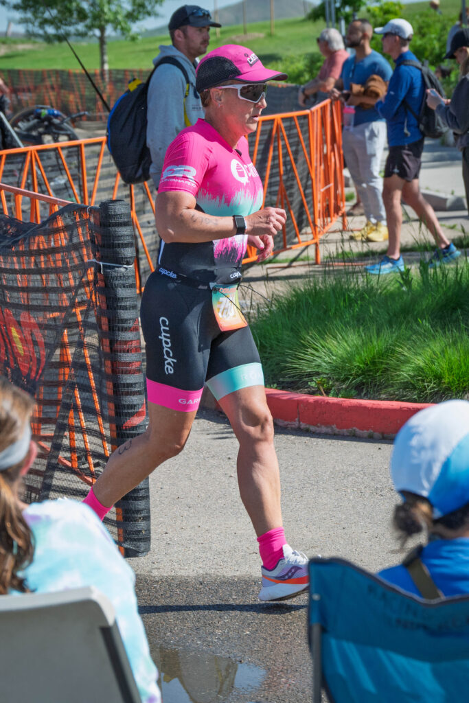 After 5 minutes after I started on the bike, I felt the wind. I was really gusting, which isn’t unusual for that area of Boulder, and I knew my split wouldn’t be as fast as it could be without the wind. I settled in, and started passing a bunch of people. That got a little unnerving while we were on the highway because cars were continually passing, and they weren’t kind enough to slow down. But I’ve been racing long enough that I know how to be safe. I felt like we never had a tailwind, so I just kept my head down and pushed the power as much as I could. Everything went fine- no flat tires or other drama. After 53 minutes, I was back in T2 at the reservoir, ready to run.